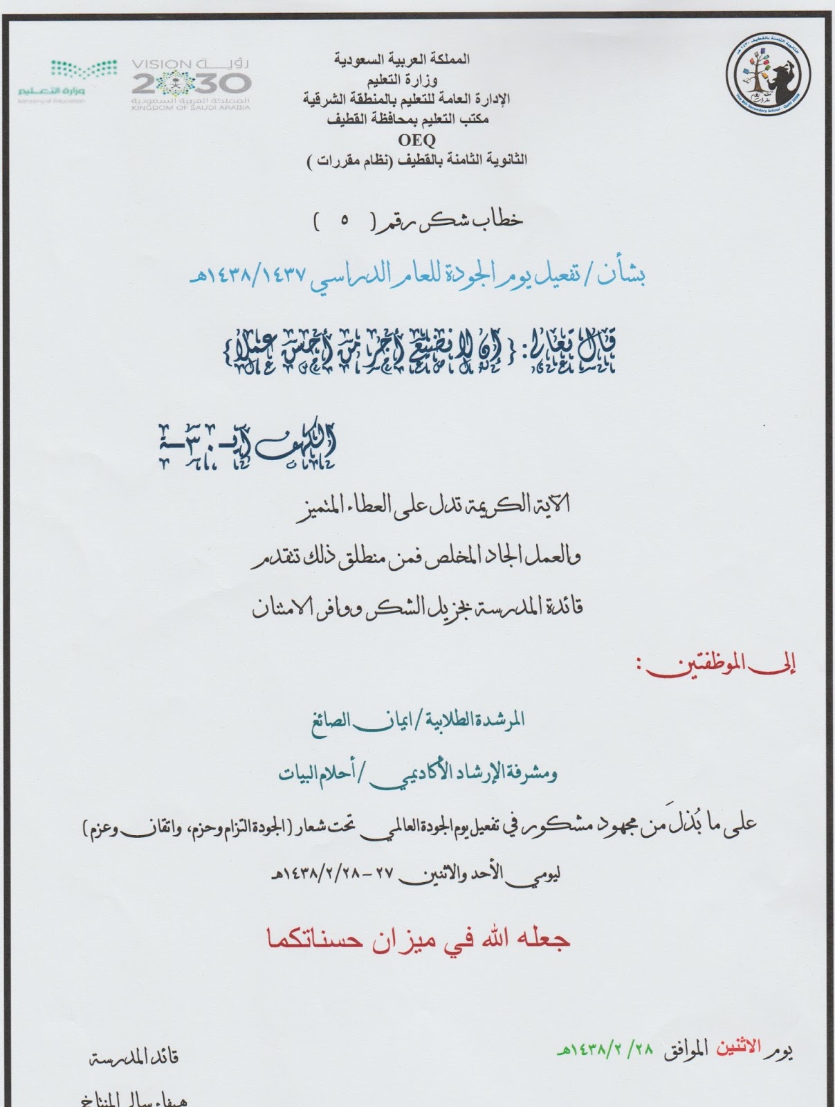 بالأسماء تكليف 15 قائدة و 33 وكيلة لمدارس القطيف القطيف اليوم